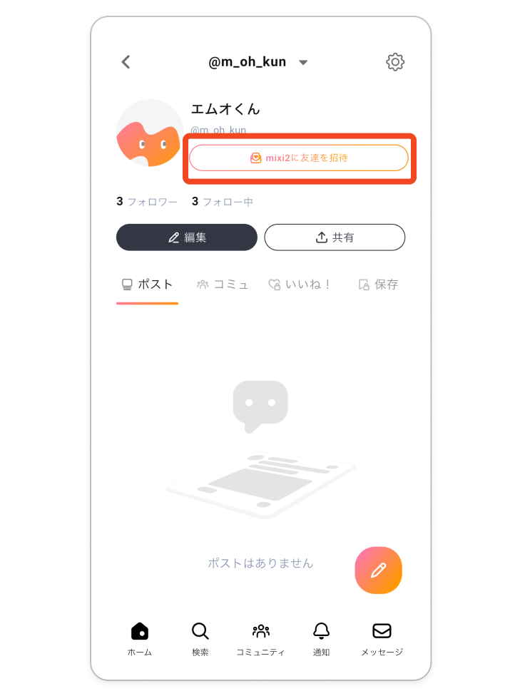 2. プロフィール画面の [mixi2に友達を招待] をタップします。