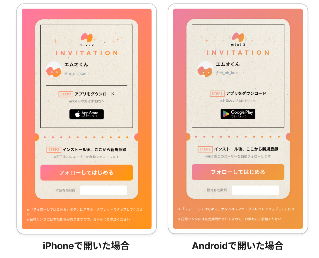 「招待画面」とは、既にmixi2を利用しているユーザーから共有された招待リンクにアクセスした際に表示される画面です。