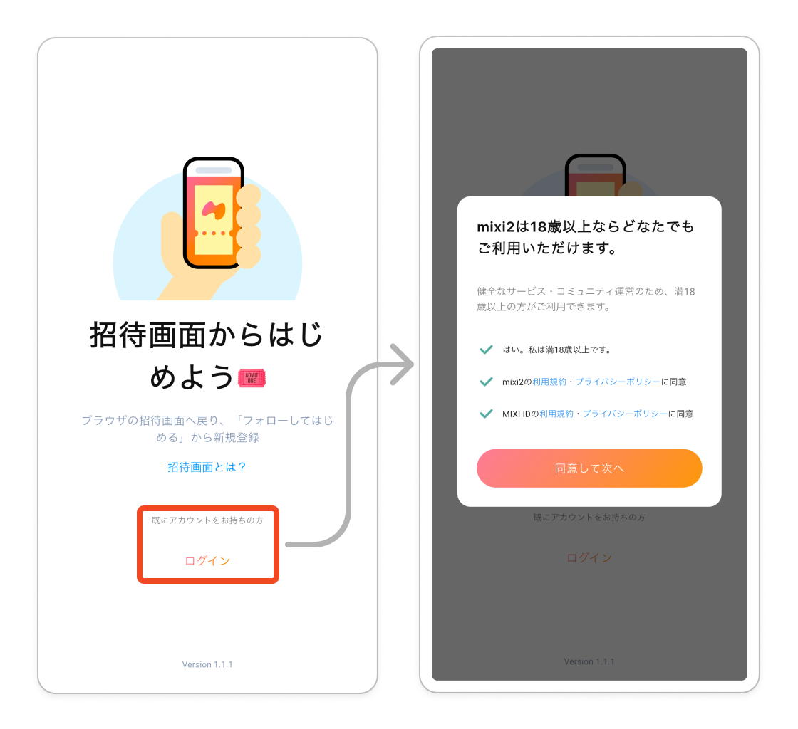 mixi2アプリを起動し、ログインフローを開始します。利用規約・プライバシーポリシーに同意の上、「ログイン」に進んでください。