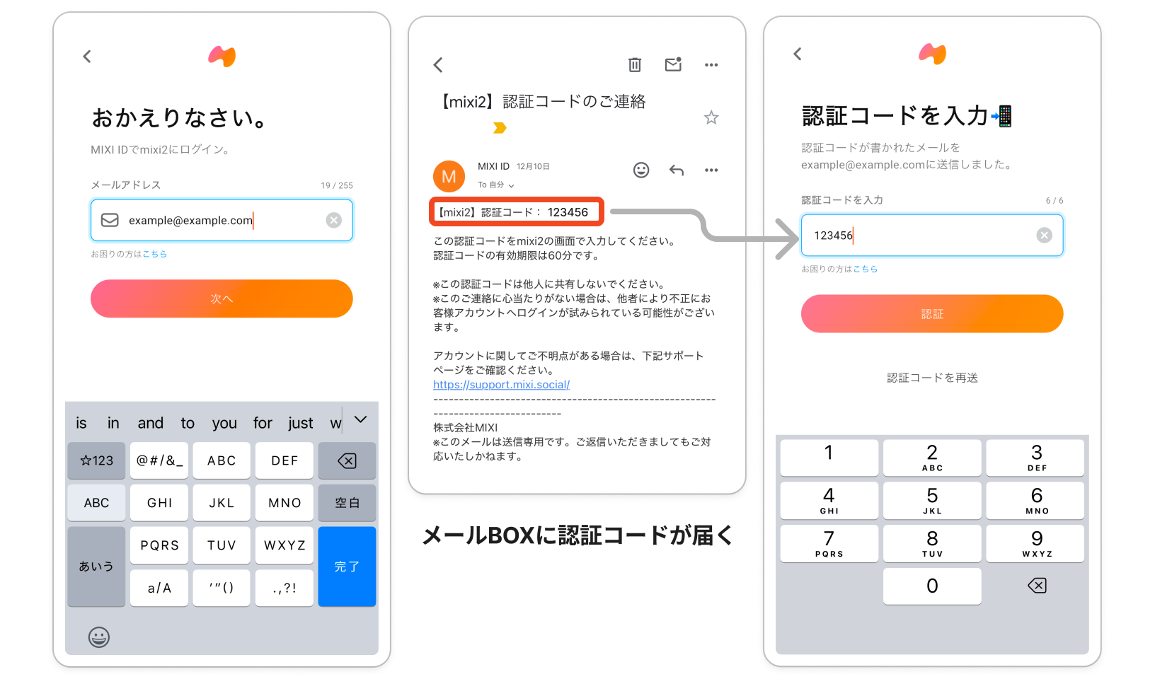 (※ 送り元: MIXI ID noreply@account.mixi.com) - 受信した認証コードをアプリ内の入力欄に正確に入力し、「ログイン」を完了させてください。