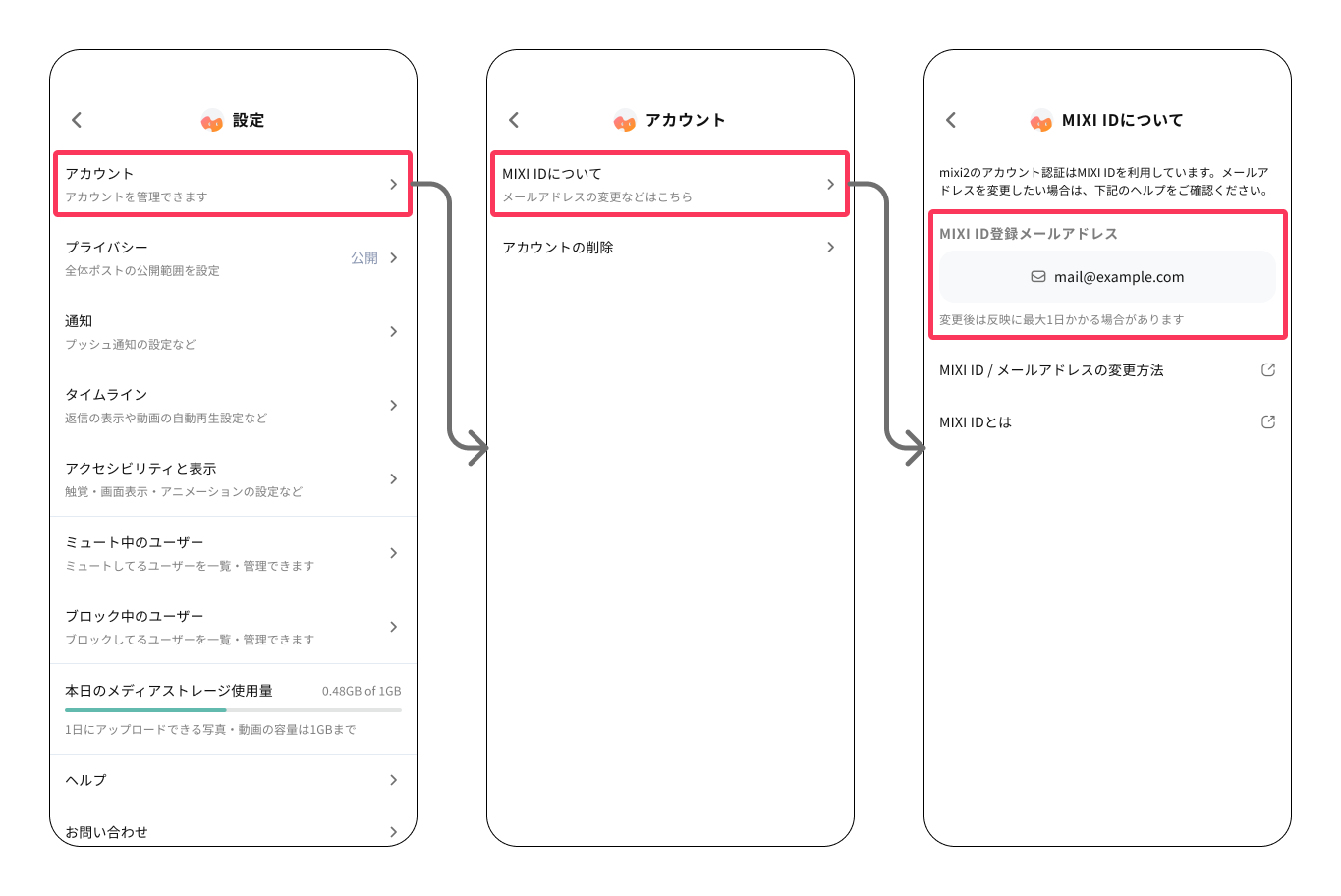 ※スマートフォンアプリでmixi2にログインできている場合は、以下の手順で登録メールアドレスをご確認いただけます。