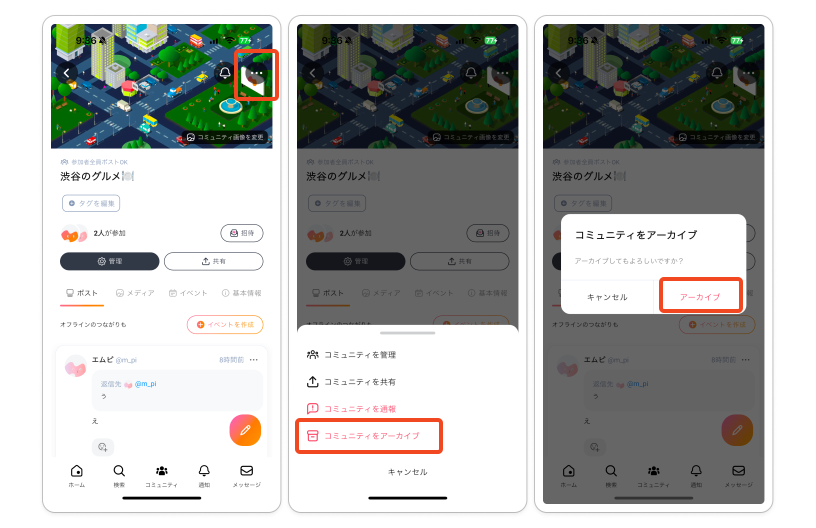 アーカイブ機能を使用すると、コミュニティへの新規投稿や参加ができなくなります。
